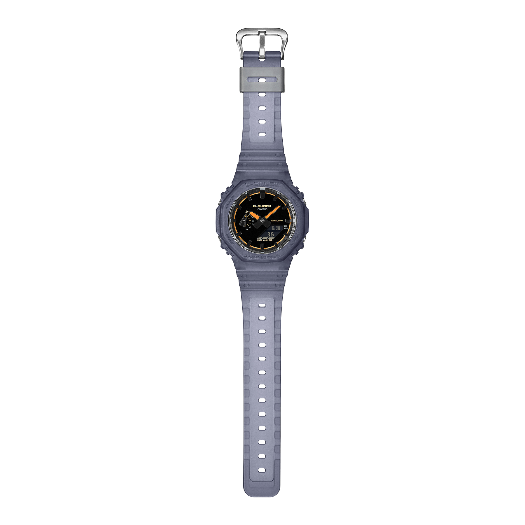 En nyutviklet overflatefinish gir urskiven et rent uttrykk, som perfekt kompletterer det strømlinjeformede designet til GA-2100-klokkene. Den glatte overflaten er det ideelle lerretet for den glansfulle finishen og den rike fargepaletten, som fremhever den imponerende dybden i pianolakk-svart.