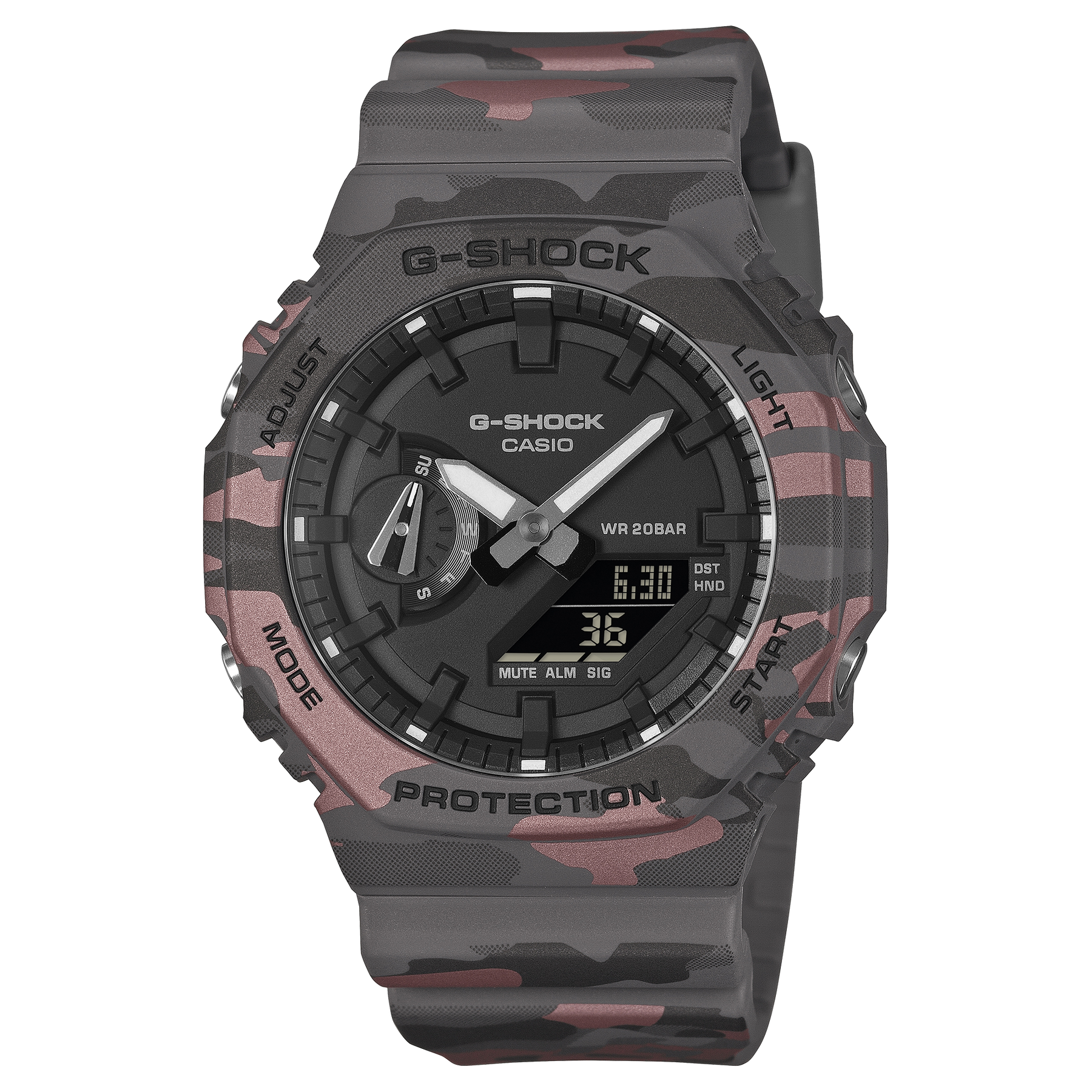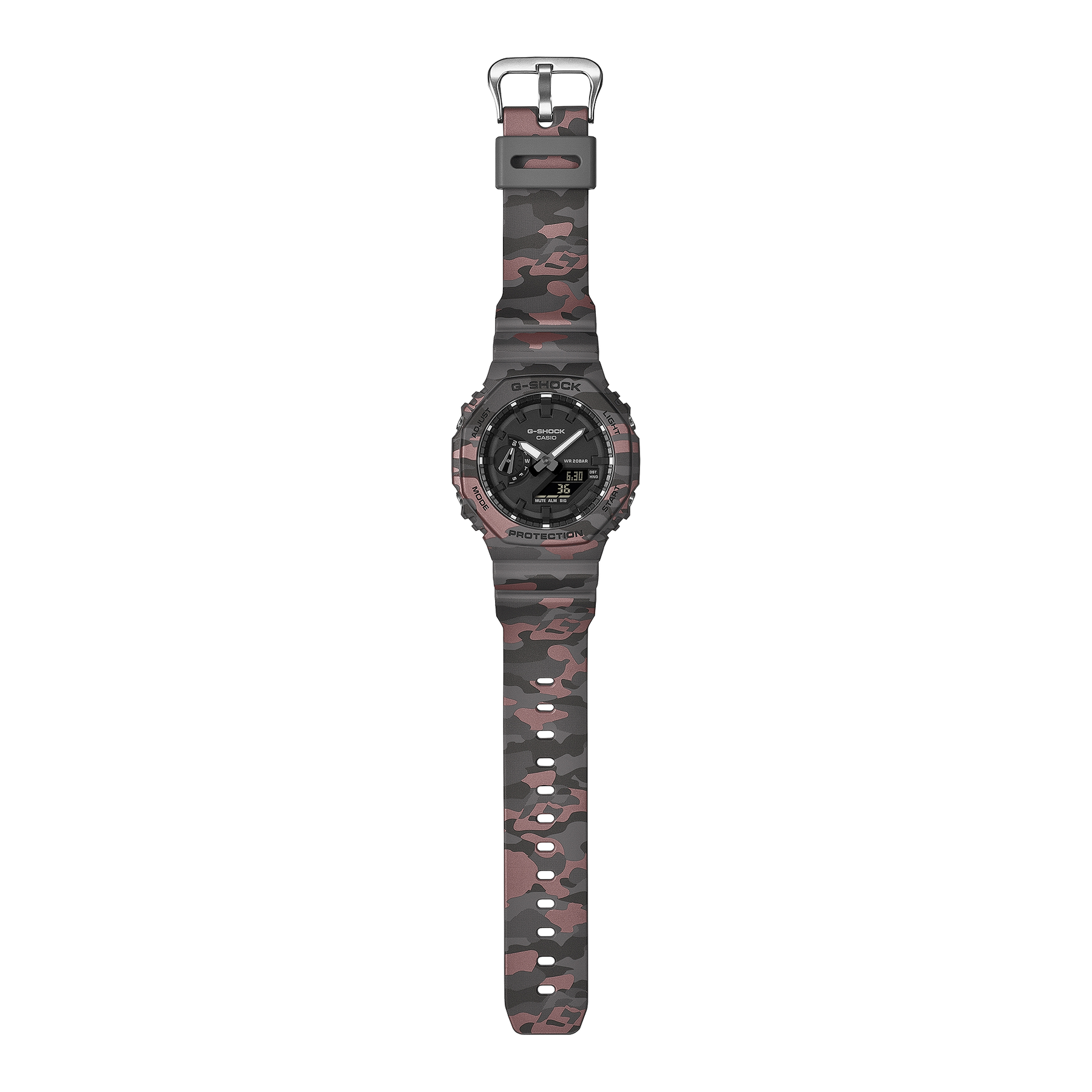 Dette nye, unike G-SHOCK-kamuflasjemønsteret skjuler på smart vis merkets ikoniske G-symbol i et særegent og selvsikkert design. Metallisk trykk løfter vanlig kamuflasje til et helt nytt nivå av sofistikasjon.